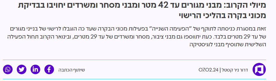 שגובהם אינו עולה על 42 מטרים (למגורים כולל עירוב שימושים) או 29 מטרים (למסחר, ציבור ומשרדים),